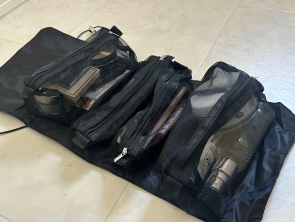 ダイソーで購入した「トラベル化粧バッグ」550円(税込)は、4つのメッシュポーチに分類収納でき、必要なものをひとまとめにして持ち運ぶことができる万能なポーチです。