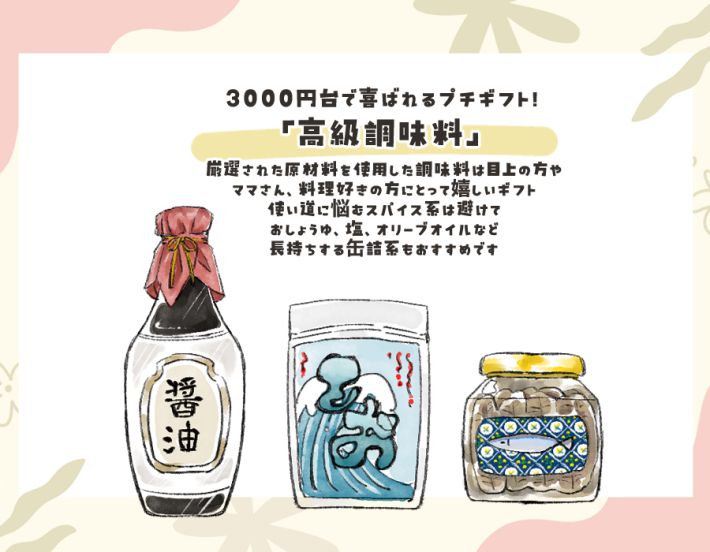 醤油・塩・出汁・オリーブオイルといった、どの食卓にも必要とされる王道の調味料を選んでくださいね。