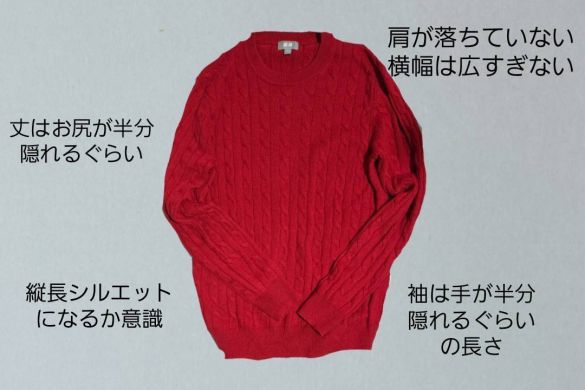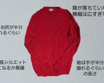 メンズニットを選ぶときは必ず試着してサイズ感を確認してほしいです。もともと男性のサイズで作られているので身幅は大きく、身丈、袖も長めに作られているために選ぶものによっては“服に着られている感”が出てしまいます。
