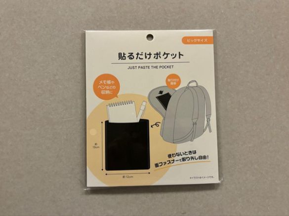 「貼るだけポケット ビッグサイズ」は、約13cm×12cmの大きめサイズのポケット。メモ帳やペン、スマホなどの収納に最適です。