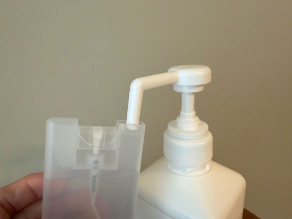 早速詰め替えてみることに。補充口は小さいですが、我が家で使用しているスプレーはノズルが長いタイプなので、ノズルをそのまま口に差し込んでスプレーしてダイレクトにで詰め替えることができました。アルコール液はボトルの8分目以上には入れないよう注意書きがあります。