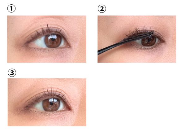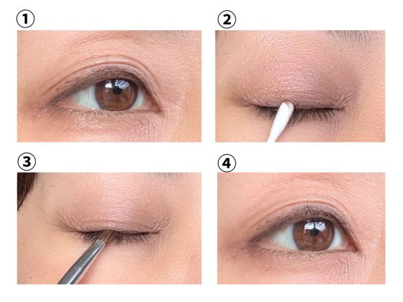 小刻みにガタガタしているときは、アイラインが乾く前に通常の乾いた状態の綿棒でやさしくならしていきます。(②)その後アイライナーと同系色の締め色のアイシャドウを重ねると、うまくカモフラージュできます。(③)
