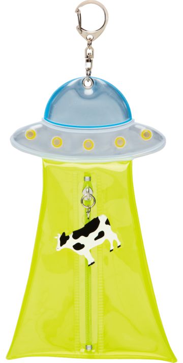 光線をイメージした蛍光色の小型ポーチで、ファスナーについている牛のアクリルチャームを上げ下げしたくなります。