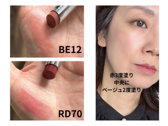 淡いトップスの日、赤だけでは強いと感じるときに、上からふわっと淡いピンクをオン。すると、血色感は残しつつ、柔らかい印象に変わります。素顔がきれいに見えるような仕上がりになります。