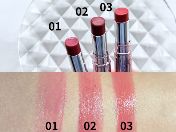 色は、全部で3色。「01 ライチペシェ」は、ウブな唇に仕上がる可憐な青みピンク。「02 ロゼフランボワーズ」は、肌に透明感を与え、自然な血色感を与えるローズピンク。そして、「03 グァバシェイク」は、顔色がパッと明るくなりそうなコーラル。