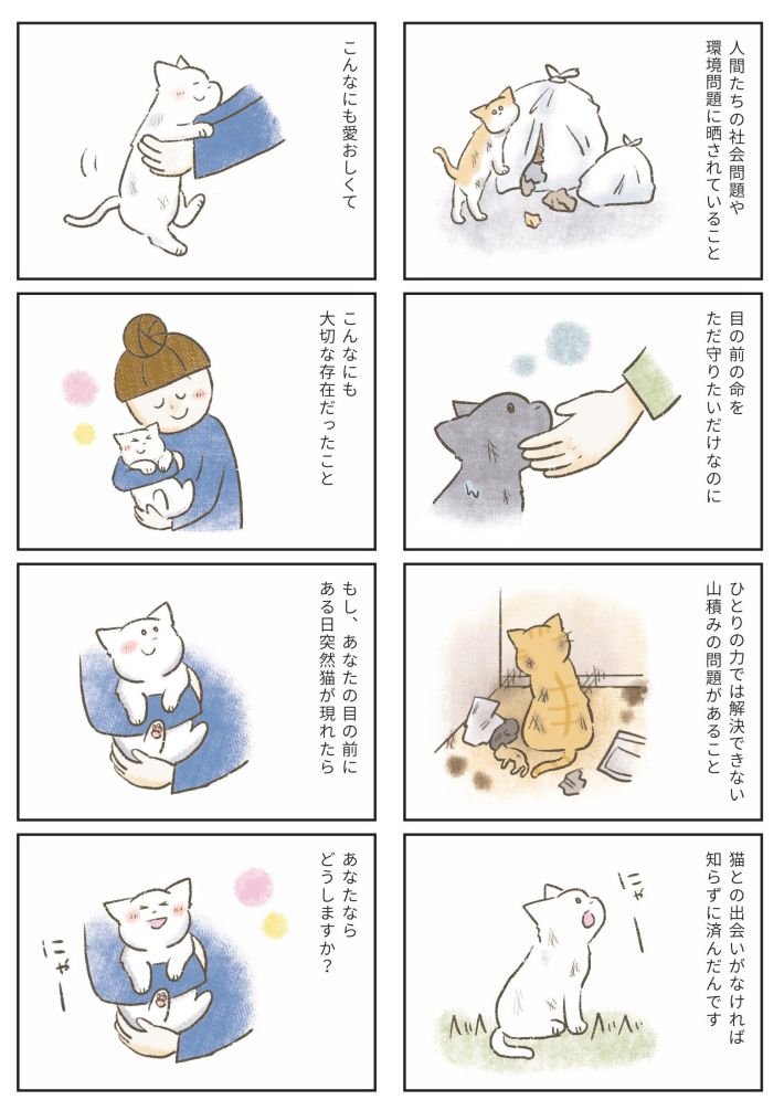『たまさんちのホゴネコ2』の中には、顔にひどい傷を負った猫「いのり」くんが登場します。佐世保市動物愛護センターの実話で、その顔を見た瞬間、センターの人は言葉を失ったといいます。治療後のいのりくんの写真も載っていて、その生命力に胸がいっぱいになります。