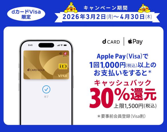 まずはdカードのキャンペーンについてです。現在、期間中にdカードVisaを1回1,000円(税込)以上支払うと、30%キャッシュバックキャンペーンが開催されています。キャンペーン期間は4月30日(木)23時59分まで。