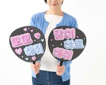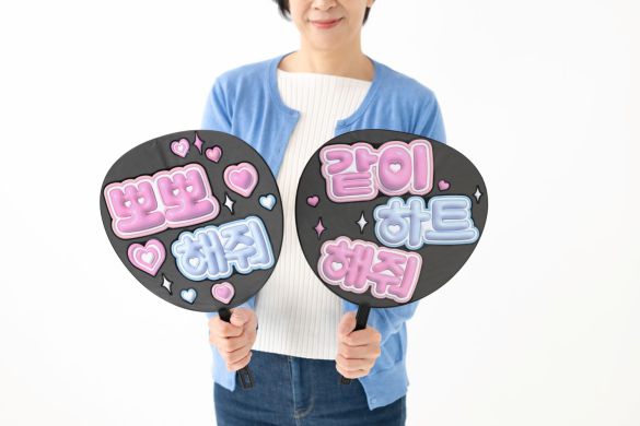 コンサートでの応援には、うちわや応援ボードにメッセージを書くのがお約束です。せっかくコンサートを見に行くのですから、推しへの思いや、お願いをうちわに書いてお願いしてみてはどうでしょう。もしかしたら、あなたのメッセージに推しが応えてくれるかもしれませんね。よく使われるフレーズを少し紹介します。 ●大好き チンッチャ チョア 진짜 좋아 ●ウインクして ウインクヘ ジュォ 윙크해 줘 ●こっち見て ヨギ ジョ〈ム〉 プァ ジュォ ※〈ム〉は小さいム 여기 좀 봐 줘  K-POPの韓国コンサートでは、自作のうちわや応援ボードの持ち込みやサイズなどがルールで厳格に決められている場合がほとんどです。日本公演ではOKでも、韓国公演では禁止という場合もあります。かならずグループの公式ホームページで事前に確認しておきましょう。  うちわや応援ボードが使えない場合でも、ペンライトはOKです。ペンライトは韓国語では「응원봉(ウンウォンボン)」(応援棒)と言います。K-POPの場合、推しの公式カラーが決まっている場合もあります。会場を公式カラーでいっぱいにして一体感を楽しみましょう。