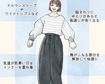 朝晩の外出は寒いけれど、日中は暑い。そういった時期の寒暖差コーデに欠かせないアイテムが、袖の縫い目が幅広な「ワイドアームホールタイプのトップス」です。  通常のトップスでは、袖を通す周囲は腕の大きさに沿ってジャストサイズで作られています。一方ワイドアームホールタイプのトップスは、腕のサイズよりも大きく周囲をとっており、着用すると脇から風がスースーと入るようなゆったり感が特徴的です。 寒暖差コーデ 寒暖差が激しい日、ワイドアームホールのニットやカットソーで動きやすく風通しの良い着こなしにすると、体温調節がしやすくなりますよ。ただ、1枚で着ると寒さを感じやすいため、インナーにはジャストサイズのカットソーを選び、その上からワイドアームホールのニットをONすることで、適度なバランスで温度調節ができます。