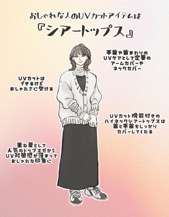 UVカット 紫外線対策のアイテムといえば、アームカバーやネックカバーですよね。とくに子どもの送り迎えで自転車を利用するママさんは、両腕から手にかけてのUV対策が必須になります。ただ、アームカバーやネックカバーってどんなにおしゃれなデザインでも、ぱっと見はどうしても“紫外線対策をしてる感”が拭えないですよね。もちろんそれでもいいのですが、せっかくなら自然な着こなしの中で、さりげなく紫外線カバーをしたいところ。  そんな時に役立つのが、UVカット機能付きのシアートップス。定番のアームカバーやネックカバーよりも高いUVカット効果ではないかもしれませんが、それでも十分にカバーできます。両腕に日焼け止めを塗って、UVカットのシアートップスを重ね着。その上からスウェットなどのトップスをさらにONすれば、おしゃれだけどしっかりと対策もできますよ。
