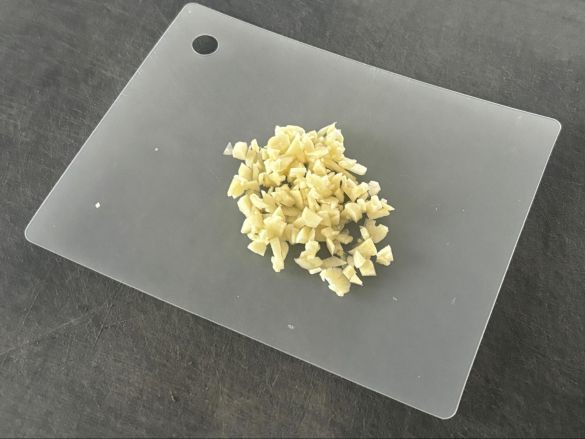 今回は、風味づけに少量だけ使用したいニンニクのカットに使用してみました。ニンニクなどの薬味はにおい移りが気になるので、まな板シートがあると便利ですよ。まな板が汚れやすい食材のカットには必需品になっています。