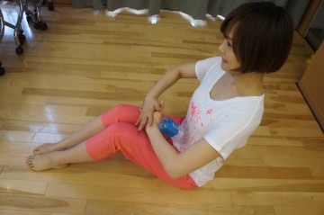 ■床に座り、膝を立てた状態でペットボトルをお腹にあてる