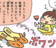 靴の表面に防水スプレーをかけておくと、汚れ防止になり、雨などの水がしみて靴が傷むのも防げます。でも、出かける直前にスプレーしても効果は出にくいのでNG。じつは、事前にスプレーし、乾燥させてからでないと効果はないのです。さらに、「スプレー→乾燥」の流れを2、3回繰り返すと効果がアップ。糸目から水が上がってくるので、ステッチにもスプレーすれば完璧です!