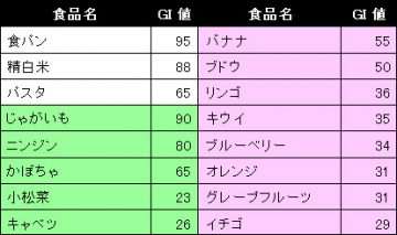 野菜や果物のGI値。果物のGI値が意外と低いことがわかる。