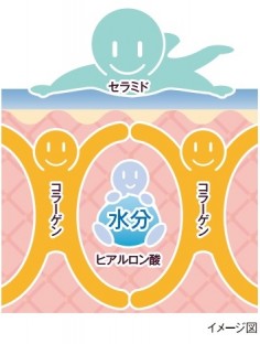 肌本体ともいえる真皮の中で、水分をぎゅっ~っと抱え込んでいるのが「ヒアルロン酸」。そのヒアルロン酸をロープ状になった「コラーゲン」が包み込んでガードし、肌表面の角質層で、「セラミド」が肌全体のうるおいを閉じ込める――というのが、肌本来の水分保持機能です。