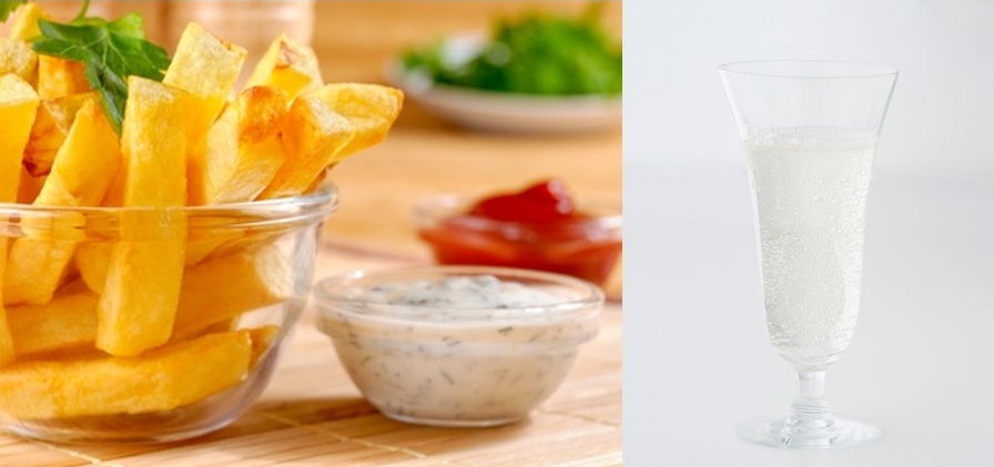 ディップでアレンジできるフレンチフライと「洋梨のスパークリング」。今年、広尾のフレンチフライ専門店に行列ができたそうですが、ビールのつまみと思われがちなものをカクテルと合わせるのがオシャレ。子供も大好きですしね!
