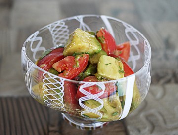 トマトとアボカドを一口大に切る。パクチーは細かく刻む。香菜が手に入らなければ、パウダー状のコリアンダーを小さじ1で代用。ボウルに全部の材料を入れて、よく混ぜ合わせれば完成。好みでタバスコを入れても美味。