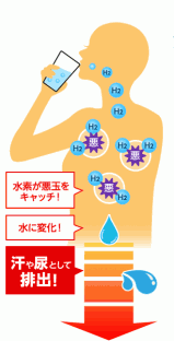 老化=酸化を引き起こすのは酸素(O)。なので、水素(H)を摂ることで、身体の中で酸素は水(H2O)に変わります。その水を汗や尿として外に出しちゃえばいいんです。結果、さびにくい身体になる。これを「還元力」といいます。「老け」のもとを体外に追い出しちゃうわけですね。