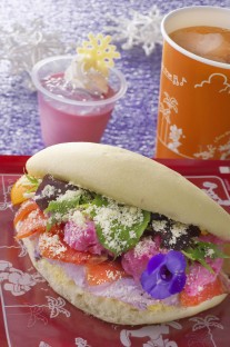 色鮮やかなサーモントラウトとポテトサラダのブルーベリーソースサンドウィッチがメインのスペシャルセット(¥1,020)。アナのドレスから着想しているそうです。「スウィートハート・カフェ」で販売中。
