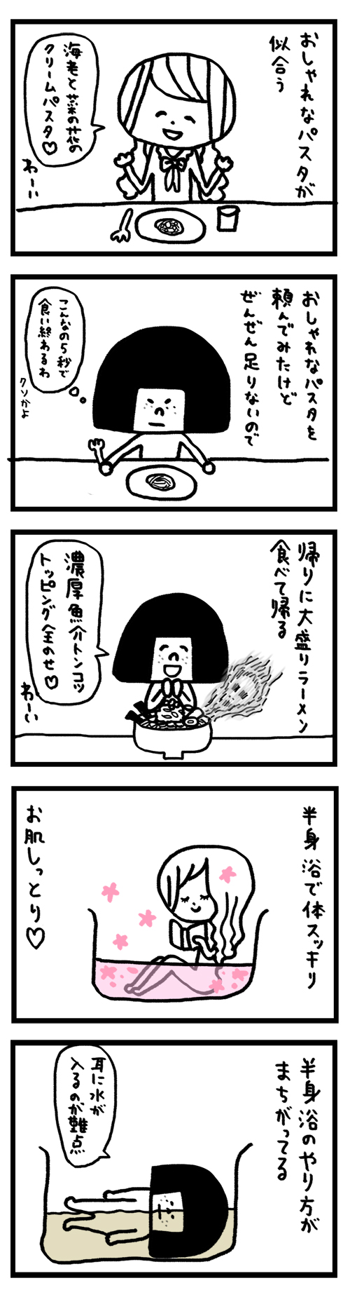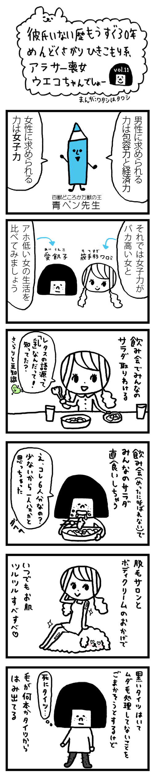 さて。今回は女子力が高すぎるワロミちゃんと低すぎるウエコちゃんの二人の生活の違いのお話でした。どうです? 高低差ありすぎて奥歯痛くなってきたでしょ。歯ァ磨け!!