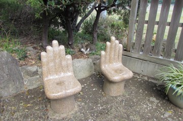平日の昼だからか、神社と美術館の敷地の前には人っ子一人いません。恐る恐る敷地の門をくぐると、奇妙な手型の椅子が……あれ?