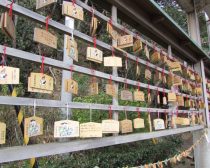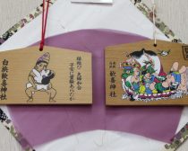 ▼絵馬(550円)。独特なイラストが描かれた絵馬は、参拝者に人気。入口にもたくさんの絵馬が並んでいました。