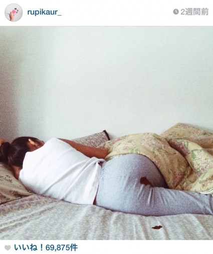 この“経血漏れ”写真を投稿したのは、アーティストで詩人のルピ・カウル。カナダのウォータールー大学に通う彼女は、専攻するヴィジュアル・レトリック・コースのプロジェクトとして、自身のさまざまな経血の写真を撮影し、「Period(生理)」シリーズとして自身のホームページで公開していました。