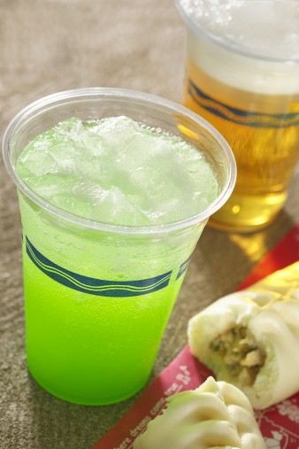 色鮮やかなグリーンが特徴のマリブメロンソーダカクテル(¥680)。写真奥は生ビール(¥600)、手前は人気のギョウザドッグ(¥420/販売店舗は3点すべてリフレスコス)をほおばりながら。