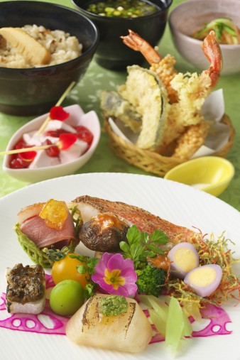 パーク内唯一の和食店もイースターが。スペシャルセット(¥2,880/販売店舗レストラン櫻)では主菜盛り合わせ、天麩羅盛り合わせ、季節の小鉢、竹の子ご飯、味噌汁、さくらパンナコッタのボリューミーな内容です。
