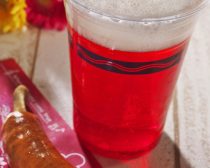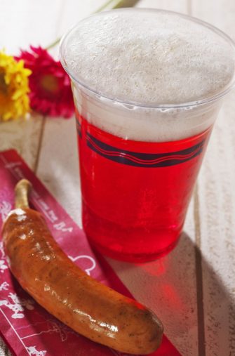 アルコールOK! の東京ディズニーシーで、まずお勧めしたいのがビアカクテル(¥680/販売店舗バーナクル・ビルズ)。ストロベリー味でさっぱりと。写真手前は骨付きソーセージ(¥370)をおつまみにどうぞ。