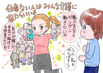 「私ね。“仕事がない”とか言う人、全員介護に来たらいいと思うんだよ。万年人不足だから絶対に採用されるし、最初は給料が安いけど、資格を取ればちゃんとある程度はもらえる。辛いしキツイし、楽しいとは思えないけど、仕事ってそういうものでしょ。かなちゃんの仕事は楽しそうだけど、でも、専門職だからこその大変さがあると思う。だからこそ、世の中の仕事がないって言っている人とか、仕事を選んでグダグダ言う前に、介護の世界に来れば、めっちゃしごいてあげるのにって思うんだよね」