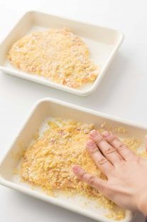 (2)1の豚肉を、卵液(卵1個、小麦粉大さじ3、水大さじ1を混ぜ合わせる)にくぐらせ、パン粉(パン粉1カップ、オリーブオイル大さじ3、粉チーズ大さじ2を混ぜる)をまぶす。