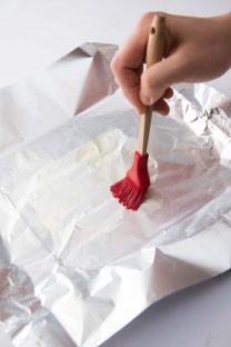 (3)オーブントースターのトレーにアルミ箔を敷いてオリーブオイルを薄く塗り(写真)、(2)をのせてタイマーを10分にセットして焼く。タイマーが鳴ったら裏返してさらに5分焼く。