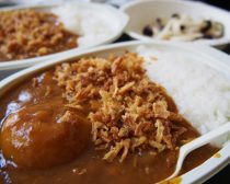 そして『ヒルダンス』ならではのお楽しみ、ランチはというと、沖縄名物ラフテーをふんだんに使い、丸々まんまのたまねぎが入った「ラフテーカレー」(500円)。