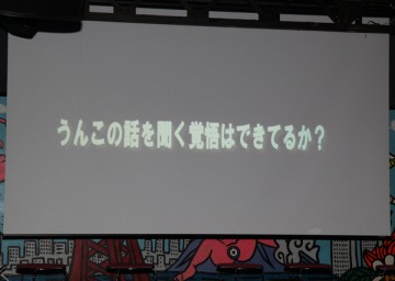 「うんこの話を聞く覚悟はできているか?」という、観客をひるませるような強烈なキャッチコピーがスクリーンに浮かび上がり、第一部が開幕。女性たちの黄色い歓声を浴びて登壇した男優達が、“親バレ問題”などのあるあるネタでフリートークを行った。信じられないことに、現在母校に出演AVが並んでいるという人気男優のしみけんは、「親バレのきっかけは『清水部長の息子さんはAV男優なんですか?』と父親が部下に聞かれたことだった」と戦慄のエピソードを披露。5月に開催されたAV男優オーディションで最優秀賞を受賞したばかりでまだデビュー前のまどわくに対しても、「覚悟を決めて今から親に電話しろ! 大人気の一徹も、汁男優時代に目の前で“汁親”に電話させてから売れたんだ」とけしかけて断られる、微笑ましい(?)一幕も見られた。