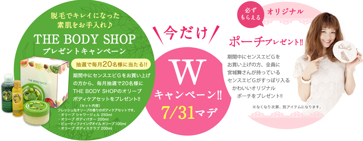 只今、THE BODY SHOPとのコラボで、スペシャルボディケアセットをプレゼントするキャンペーンを実施中とのこと。脱毛した肌のアフターケアに最適です。今年の夏は、ツルツル美肌でモテ女を目指しましょう!