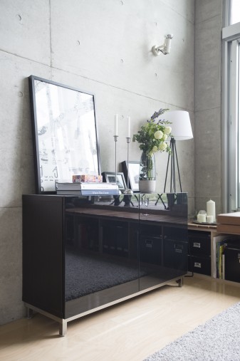 まずは、IKEA港北のインテリアデザイナーでバスルームエリアを担当している伊藤愛子さんのお宅。彼女の家は、ロフト付きの1K(約25㎡)のマンション。一階はブラックを基調に、ロフトはホワイトを基調にし、インテリアも白黒の2色で構成するなど、まるでホテルのような雰囲気の部屋です。