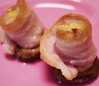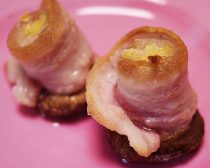 (1)しいたけは、濡れた布巾でやさしく拭いて汚れを落とす。水洗いは厳禁。石づきを切り取る。豚バラをクルクルと巻き、しいたけの内径の太さにしてギュッと押し込む。軽く塩を振る。