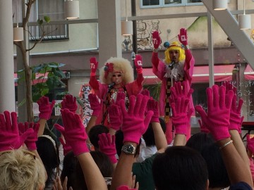 参加型がレ・ロマネスクのライブ。TOBIさんのコールにお客さんもレスポンス! みんなで手を下から上へと掲げながら踊る様子は圧巻です。端から見たら何かの宗教儀式か、怪しいセミナーのように見えるのでしょうか。道行く人がけげんそうに立ち止まり、あっけにとられている姿が印象的でした。