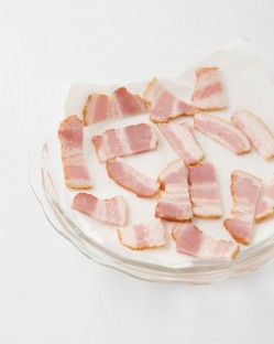 (1)カリカリベーコンをつくる。ベーコン2~3枚は1.5㎝幅に切り、ペーパータオルを敷いた耐熱皿に並べ、ラップをしないで電子レンジ(600W)で40~50秒加熱する。