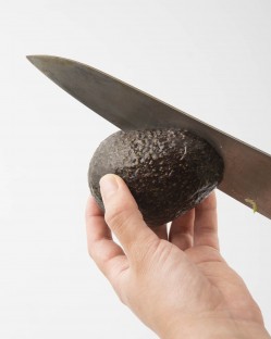 アボカドをもって縦に包丁を入れ、種に添ってグルリと1周させる。