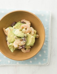 (2)ボウルにマヨネーズ、レモンの絞り汁各大さじ1、オリーブオイル小さじ1、塩、コショウ各少しを混ぜ合わせ、(1)のアボカドとゆでエビ100g、ミックスビーンズ1パック(50g入り)を加えてあえる。