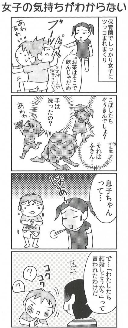 失敗したときに――たとえば男性がコーヒーをこぼしちゃったとして、キビキビと雑巾で拭きながら、『もう!』って叱られる――そんなふうにお世話を焼かれるよりも、『こぼしちゃったんだ、アハハハハ』と笑ってくれる子のほうがいいみたいなんですね。息子を含め、男児たちを見ていてそう感じました。