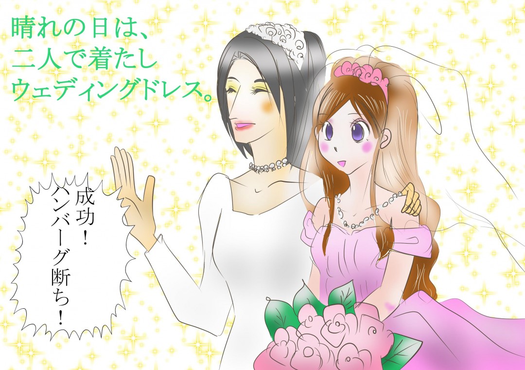 私達の結婚式は、ちょっと特殊でした。新郎新婦がともにウエディングドレス! イェイ!