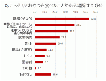 ところが問題は、お菓子を堂々と食べにくい職場があること。調査では、4割の女性が仕事場でお菓子を「こっそり食べる」と答えています。では、どこでこっそり食べたことがあるか、というのが以下のグラフ(複数回答)。