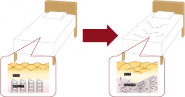 ベッドでたとえるなら、エラスチンはスプリング、コラーゲンはマットだそう。いくらマットがしっかりしていても、スプリングがヘナヘナだったら、圧力をはねかえすことができませんよね。このエラスチンが変性してしまうのが、シワの大きな原因だったんです。