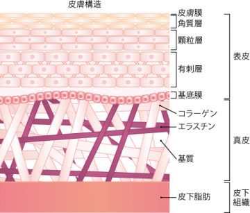 弾力線維エラスチン(以下、エラスチン)は、肌の奥深く(真皮)にあって、コラーゲンを支える役割をしています。