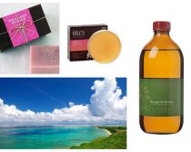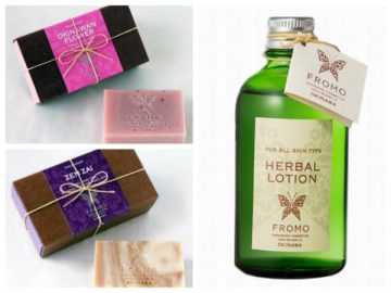 手作り石鹸が有名。OKINAWAN FLOWER(ハイビスカスの石鹸、左上)、ZENZAI(左下、黒みつとあずきの石鹸)、右はハーバルローション http://www.fromo.jp/index.html