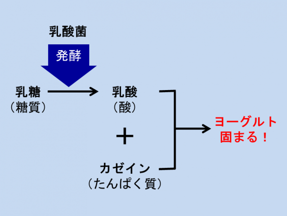 ヨーグルトの基本原料は、「牛乳」と「乳酸菌」。乳酸菌は、牛乳の中に含まれる「乳糖」という糖分を分解して「乳酸」という酸を作り出します。この酸が、これまた牛乳の「カゼイン」というたんぱく質を固めること(=凝固)でヨーグルトが出来上がるという原理。