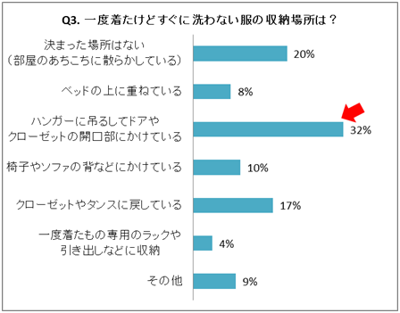 1度着た服の収納方法について質問したところ、なんと7割以上の人が、服を出しっぱなしにしていると判明。「ハンガーに吊るしてドアやクローゼットの開口部にかけている」(32%)に続いて次に多いのが、「決まった場所はない(部屋のあちこちに散らかしている)」(20%)というありさまです。